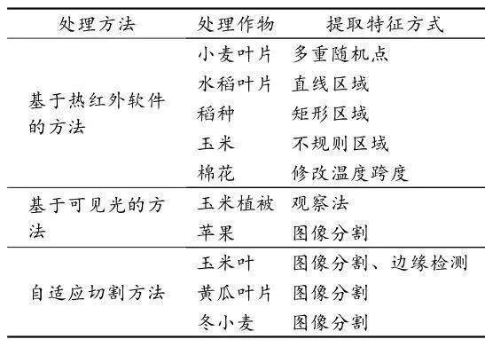 目前,主要有3種圖像處理方法,基于熱紅外軟件的方法、基于可見(jiàn)光的處理方法以及自適應切割的方法,具體如表1所示。