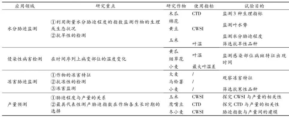紅外熱成像技術(shù)在農業(yè)中的研究和應用廣泛,以下主要從水分脅迫監測、侵染性病害監測、凍害脅迫監測、測產(chǎn)以及其他等方面介紹和討論,如表2所示。